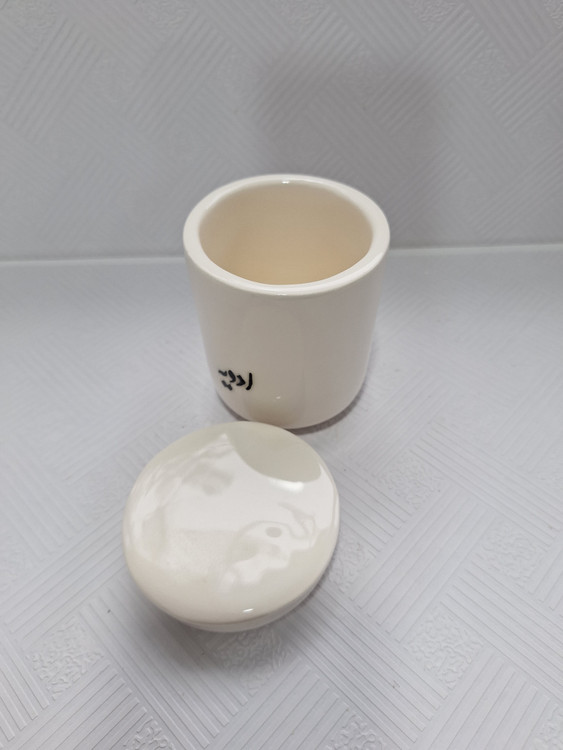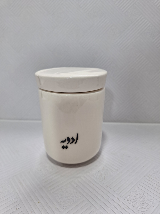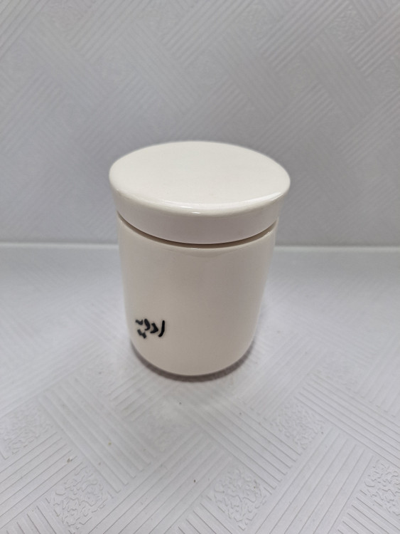 اندازه: قطر دهانه ۸ سانت ، ارتفاع با درب ۱۰.۵ سانت