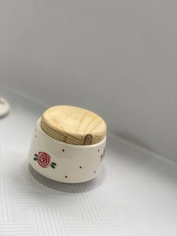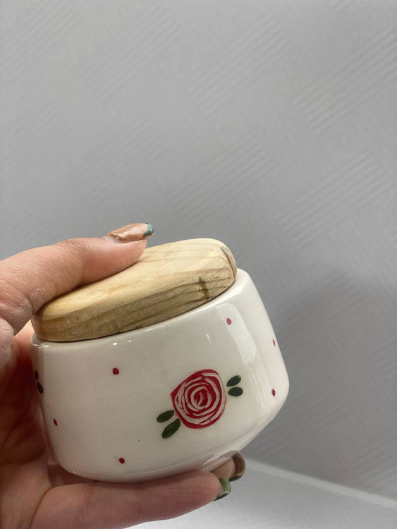 اندازه: قطر دهانه ۸ سانتی متر ، ارتفاع با درب ۶ سانتی متر